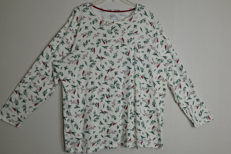 Color: White with red and green floral pattern